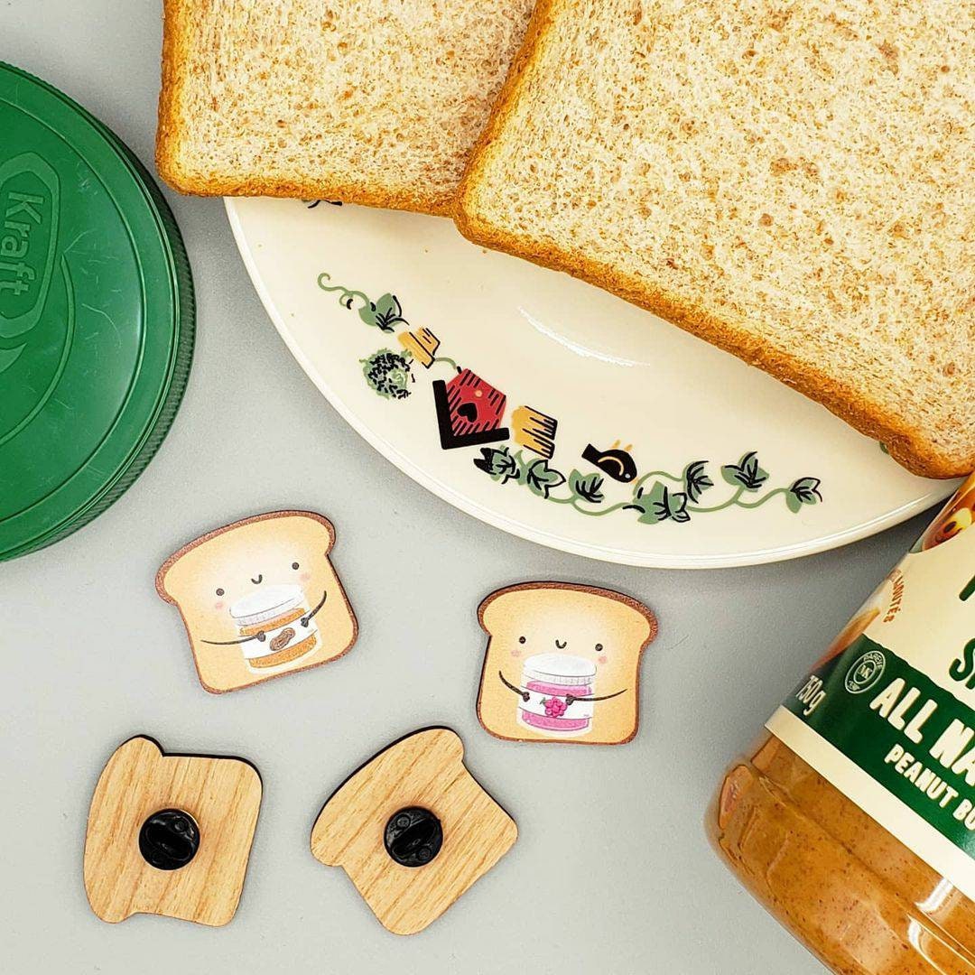 -eco-friendly -the metal backing pins are made of Birch Plywood and the rubber backing ones are a darker cherry wood - each pin will have a slightly different texture/colour