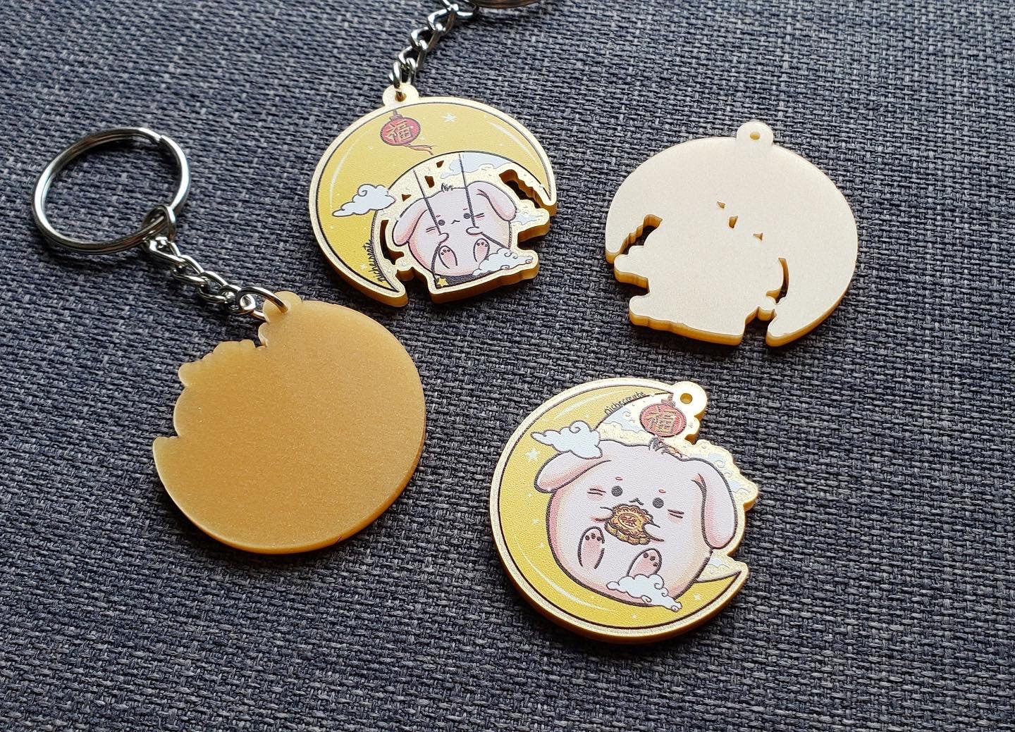 When the Mid-Autumn Festival was coming up, I decided to design a couple of metallic gold keychains to celebrate and share a bit of my culture. Growing up, we always learned about the story of the Goddess of the Moon and it just happened to work out that the characters that I have already designed are the bunny and the moon!